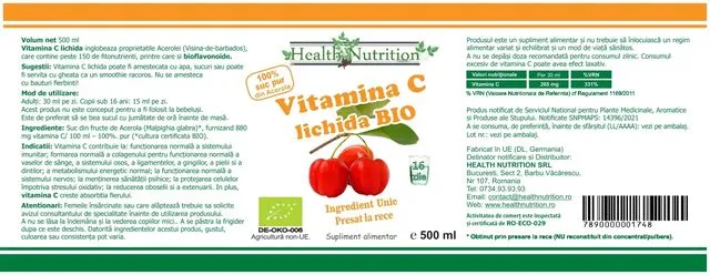 Vitamina C lichidă BIO inglobează efectele binefăcătoare ale Acerolei (Visina de Barbados), conține peste 150 de fitonutrienți, printre care și bioflavonoidele.
